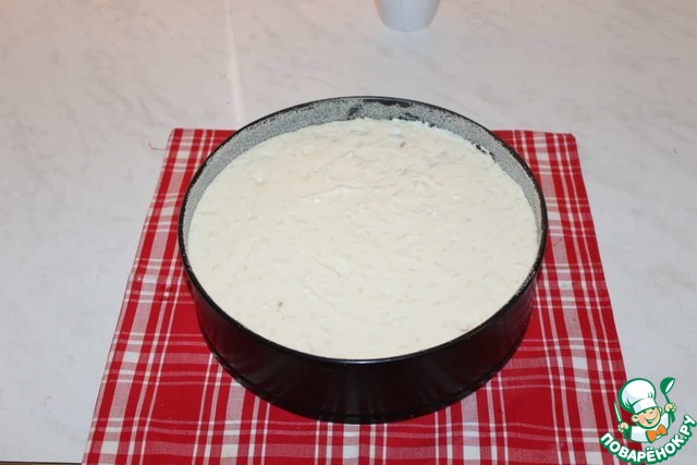 Дно формы диаметром 24 см застилаем пергаментом, смазываем сливочным маслом и обсыпаем манкой. В форму выливаем полученную смесь.