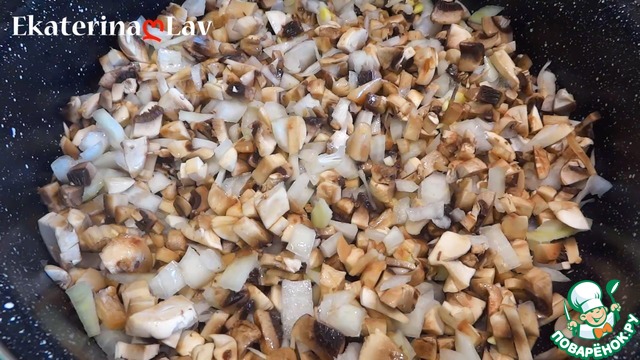 Первым делом обжариваю мелко нарезанные шампиньоны с одной мелко нарезанной луковицей, с добавлением растительного масла до готовности. Слегка солю и остужаю.