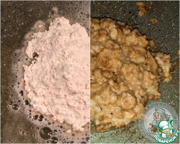 • … поджаренная мука отправляется в кастрюлю. И деликатно, но хорошо перемешать.