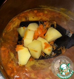 Добавить морковь к луку, перемешать. Потом добавить бульон и тушить на небольшом нагреве до морковкиного смягчения. Чтобы луковые страсти и морковная сладость объединились. В общем, должен получится такой ароматно - вкусный тушеный микс.