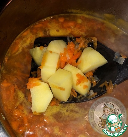 • Бульон, напомню, тщательно процеженный, довести до закипания и отправить в него штук пять не очень крупных картофелин. Картошки надо резать не сильно мелко, но и не крупно. В общем, так, чтобы в ложку хорошо легло и есть было удобно.