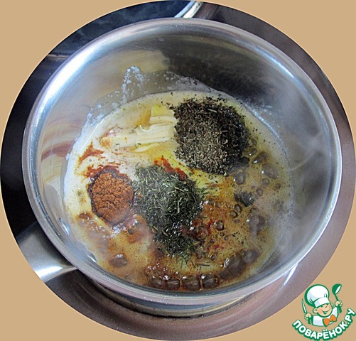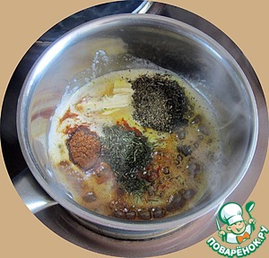 Как только масло начинает активно плавиться, снимаем кастрюльку с огня и всыпаем карри, острый красный перец, паприку, сухой укроп и сухой базилик, активно перемешиваем.