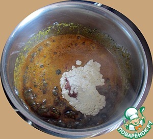 Далее добавляем томатную пасту и муку, размешиваем до однородности, добавляем коричневый сахар и снова ставим кастрюльку на самый малый огонь, мешаем и прогреваем до расплавления сахара. Добавляем горчицу.