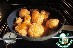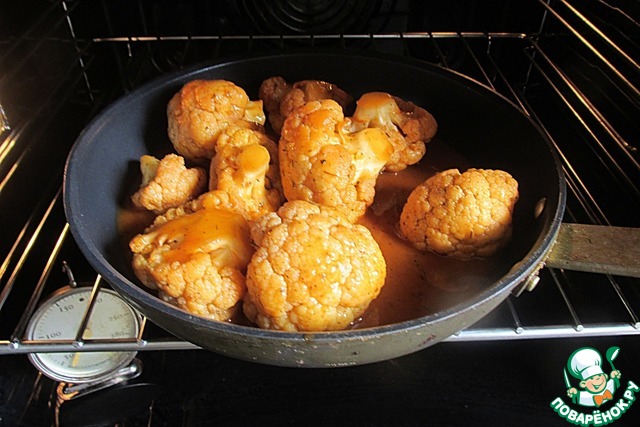 Выкладываем капусту в форму вместе с оставшимся соусом и ставим в разогретую духовку минут на 25-30. Во время запекания один раз переворачиваем соцветия и поливаем соусом со дна формы.