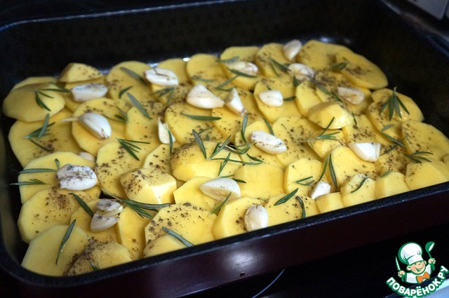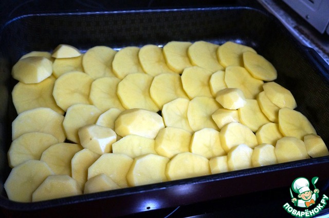 Противень смазать растительным маслом, уложить внахлест картошку.