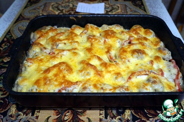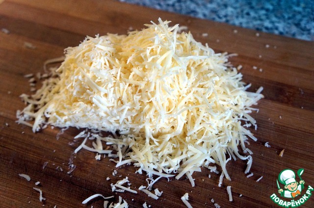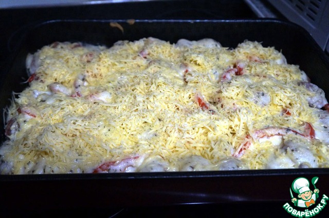Вынуть противень, быстро засыпать блюдо сыром, отправить в духовку на ту же температуру еще на 20 минут или до румянца.