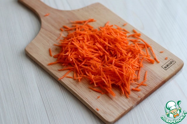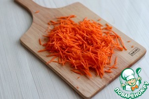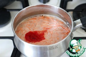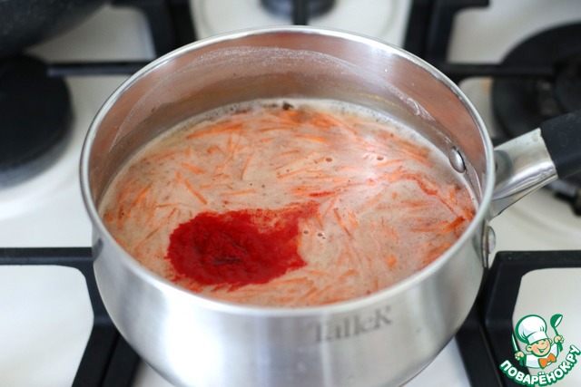 Добавить морковь в соус, добавить паприку (1/2 ч. ложки), добавить соль и черный молотый перец по вкусу. Далее добавить лавровый лист и смесь пряных трав (1/2 ч. ложки), добавить 1 ст. ложку сметаны. Варить соус на медленном огне до мягкости моркови.