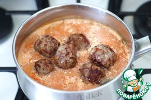 Добавить обжаренные фрикадельки в соус. Дать прокипеть соусу с фрикадельками несколько минут (3-5 мин.). Снять с огня.