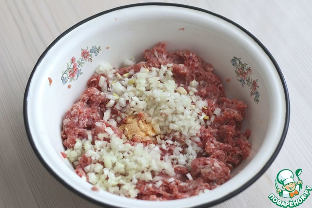 В готовый фарш (600 гр.) добавить мелко нарезанный репчатый лук (1 шт.), добавить мелко нарезанный стебель сельдерея (1/2 шт.), добавить чесночный порошок (1/2 ч. ложки), добавить соль и черный молотый перец по вкусу. Хочу обратить внимание, если вы будете готовить это блюдо для детей, черный молотый перец следует исключить или добавить минимальное количество. Фарш хорошо вымешать.
