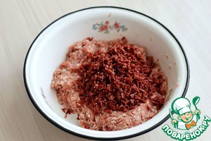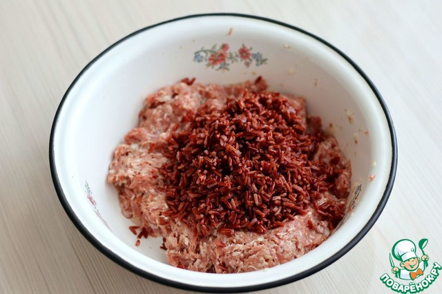 Красный рис "Рубин" (3 ст. ложки) отварить до полуготовности. Добавить отваренный красный рис в фарш. Фарш еще раз хорошо вымешать.