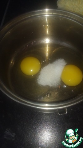 Берём пару яиц, добавляем по чайной ложке соли и сахара. Взбиваем. В муку добавляем чайную ложку разрыхлителя. Во взбитые яйца добавляем воду и продолжая взбивать, потихоньку добавляем муку. -