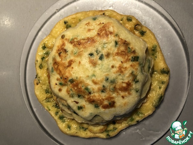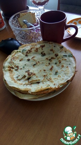 Наслаждаемся результатом. Несмотря на то, что блины на воде - они не рвутся, отлично пропекаются и симпатично выглядят. А уж на вкус... Нотки чеснока вплетаются в сырный привкус блинов и яркую свежесть зелени, ммм... Приятного аппетита)