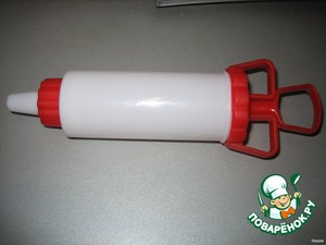 Духовку нагреть до 220 градусов. Взять кондитерский шприц (у меня вот такой) или мешок с насадкой.