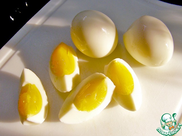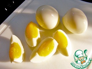 Отварим яйца, они нам понадобятся в последнюю очередь. Разрежем яйца на четвертушки. Если вы хотите, чтобы желток был немного жидким, как у меня на фото, варите яйца ровно 6 минут.