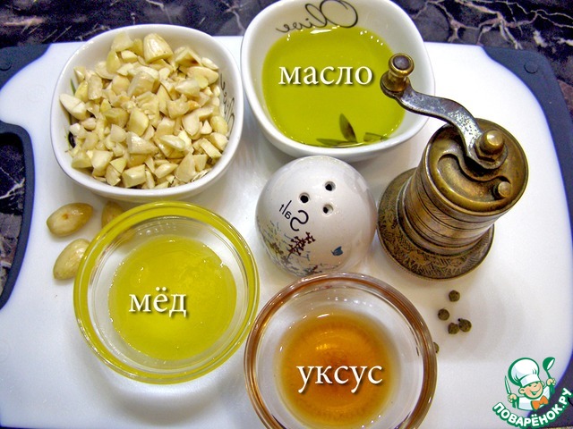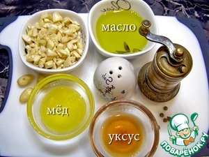 Приготовим заправку для салата. В отдельной ёмкости смешаем до однородности мед и уксус, добавим нарубленные орехи (часть орехов оставьте для украшения). Хорошо подойдет винный уксус (можно заменить на фруктовый), обычный уксус лучше не использовать– он будет слишком резким в этом салате. Продолжая помешивать, добавим масло, подсолим и поперчим. Перец советую брать зеленый, он считается лучшим для салатов, так как не имеет горечи, а только пикантную остроту. Если нет зеленого перца, можно использовать белый.