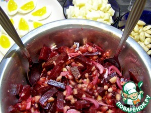 В глубокой миске смешаем подготовленную свёклу, лук и гранат. Добавим заправку и хорошо перемешаем. После этого добавим сыр и снова слегка перемешаем (немного сыра оставим для украшения).