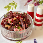 Предлагаю попробовать очень необычный салат из простых и понятных продуктов. В салате используется печеная свекла, козий сыр и гранат. Это сочетание дает гармоничный букет вкуса, приправленный свежей зеленью и приятной масляно-медовой заправкой. Салат приготовлен по рецепту J. Kenji López-Alt –известного американского шеф-повара и автора нескольких книг по кулинарии.