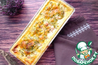 5) В выпеченную основу выложить лук, кусочки рыбы и картофеля. Залить яичной смесью, выпекать 30 минут при 180 С.