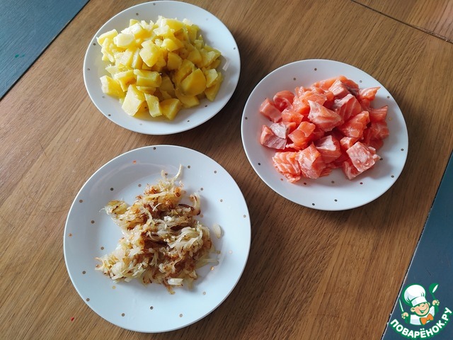 3) Лук нарезать тонкими полукольцами, обжарить до золотистого цвета. Отварить картофель, порезать кубиками. Рыбу порезать кубиками.