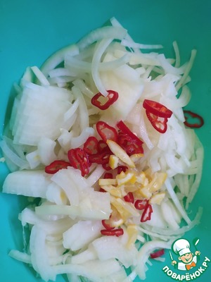 3) нарезаем красный перец Чили кружочками (можно добавить несколько кусочков, т. к. выходят довольно острыми грибы по этому рецепту) -