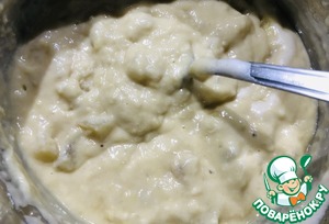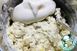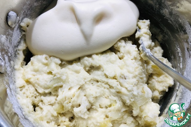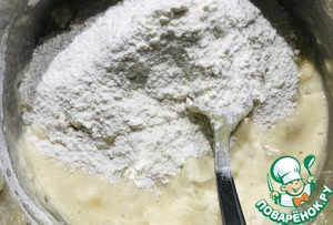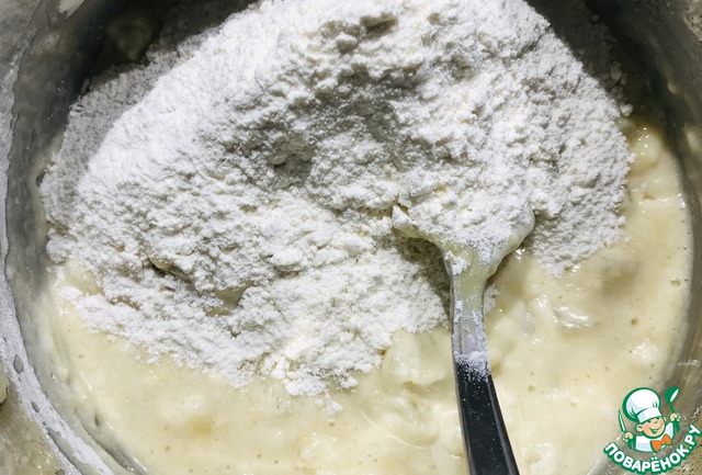 В остывшие фрукты добавить соду и постепенно добавить просеянную муку с дрожжами.