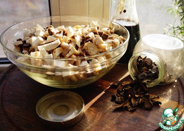 Как только начнет выделяться жидкость, крошим в шампиньоны щепотку белых грибов и добавляем столовую ложку соевого соуса. Соевый соус содержит естественный усилитель вкуса, который и добавит грибам вкуса.