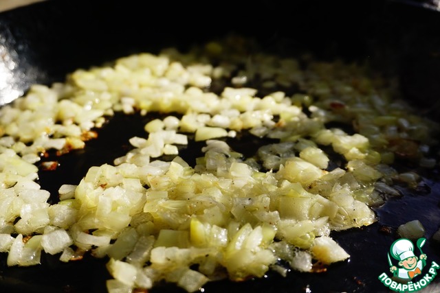 Разогреваем сковороду, наливаем растительное масло. И отправляем туда лук. Жарим до мягкости.