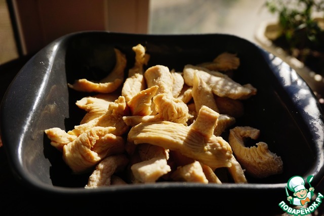 Курица у меня осталась от бульона «быстрого приготовления» по принципам китайской кухни. Ниже дам ссылку на рецепт быстрого супчика. На этот раз готовила бульон для пельменного супа, а курицу оставила на пирожки.