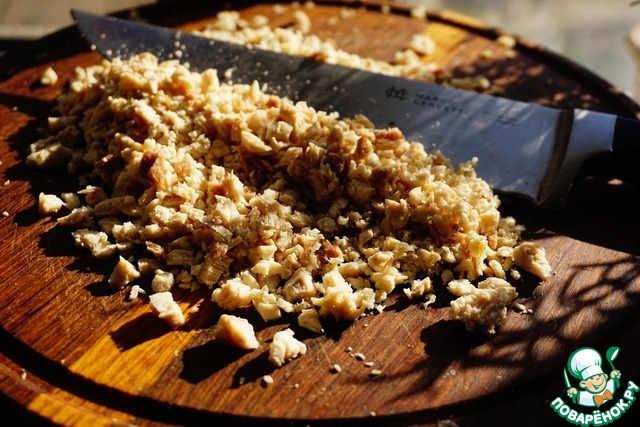 Можно, конечно, пробить курицу блендером, но я предпочитаю рубить ножом, чтобы попадались кусочки курицы.