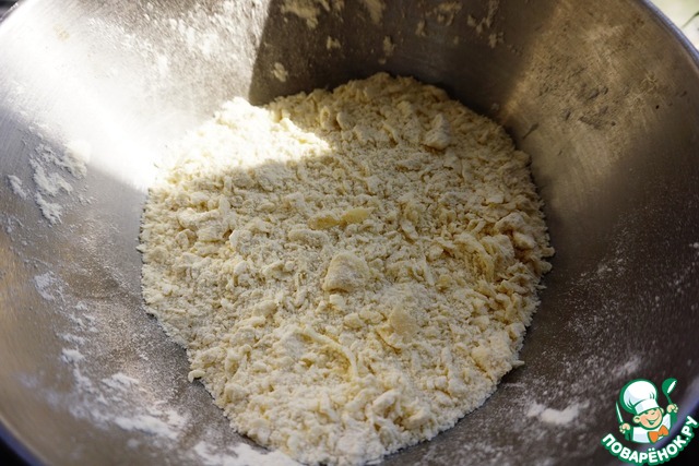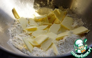 Теперь приступаем к приготовлению теста. В муку нарезаем пластинами масло.