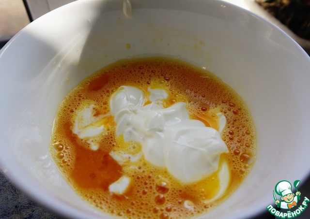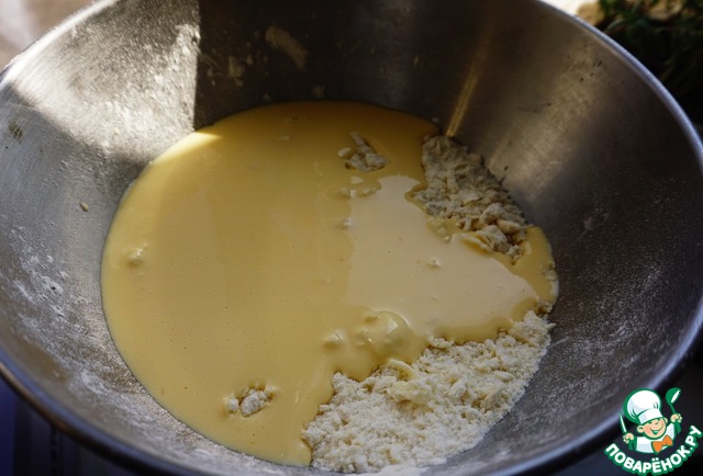 Выливаем жидкие ингредиенты к мучно-масляной крошке.