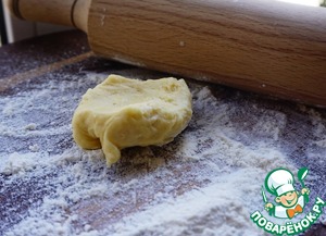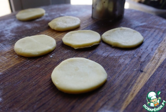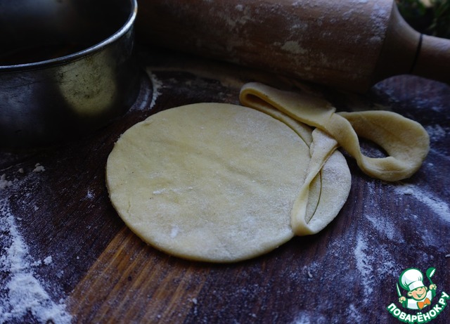Раскатываем толщиной в 2-3 мм. Вырезаем формой круг. У меня диаметр 10 см.