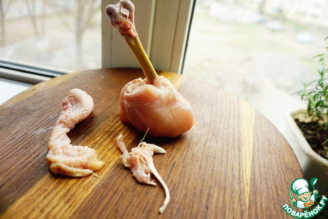 Первая трансформация. Я удалила шкуру. Муж и доця никогда куриную шкуру не ели и всегда ее обдирали, даже когда она была хрустящей и зажаристой. А я не очень люблю вареную шкурку, но имею несколько рецептов ее фарширования. Поэтому стала снимать ее с голеней, которые готовила по этому рецепту и по любому другому, где я курицу тушила. И так, снимаем с голеней шкуру. Ее можно отправить в морозильник и, в последующем использовать для приготовления фаршированных ножек. Вариант дам в конце рецепта.