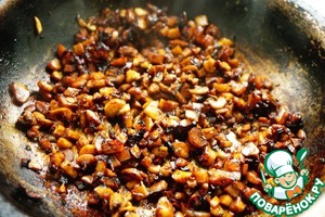 На разогретую сковороду наливаем растительное масло. Отправляем не нее шампиньоны. Как только шампиньоны станут выделять сок, добавляем в них раскрошенные сухие белые грибы.