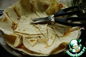 В форму для запекания выкладываем два армянских лаваша. Катя предлагает тортильи. Тоже хороший вариант. Я предпочитаю лаваш, т. к. с ним выходят более красивые "ажурные" бортики. Вы выбирайте, что больше нравится.