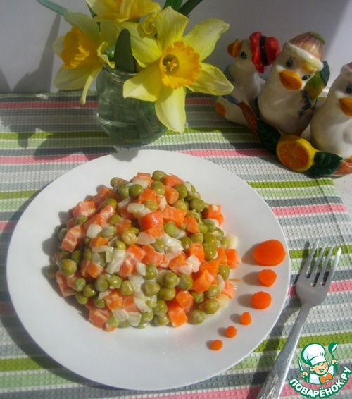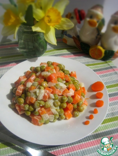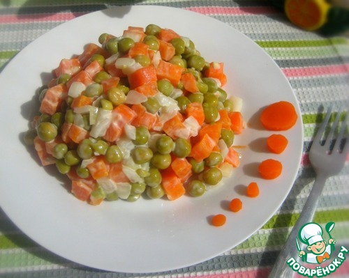 Простой, но вкусный салат всего их трех основных ингредиентов - морковь, горошек и маринованный лук и делается он очень легко - на раз, два три!