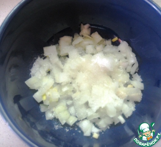 • В мисочке соединить нарезанный лук, добавить по 1 ч. л. без горки соль и сахар, влить уксус.