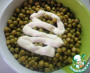 Добавить консервированный зеленый горошек (жидкость из банки предварительно слить) и заправить майонезом. Аккуратно перемешать салат и можно подавать к столу.