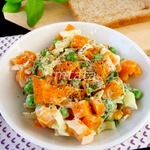 • Добавить консервированный зеленый горошек (жидкость из банки предварительно слить) и заправить майонезом. Аккуратно перемешать салат и можно подавать к столу.