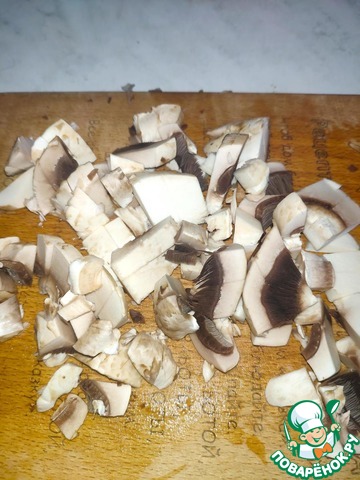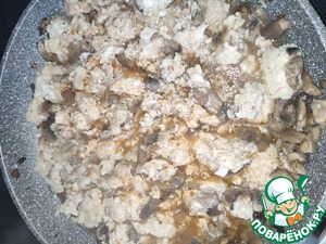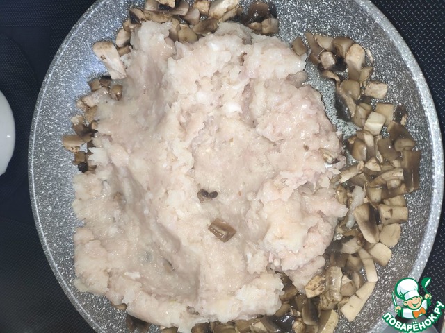Перемолотое филе куриное добавляем к грибам. Все размешиваем. Добавляем соль, перец молотый, приправы по вкусу.