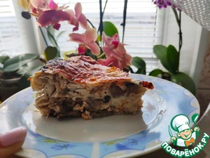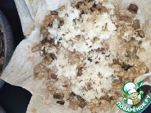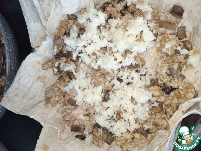 Лист лаваша кладём в смазанную растительным или сливочным маслом форму. Сверху выкладываем начинку и посыпаем сыром. Так три-четыре раза.