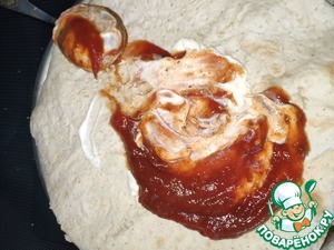 Я смазала верхний лаваш соусом со сметаной, чтоб было сочнее. Можно не смазывать, а просто посыпать сверху сыром.