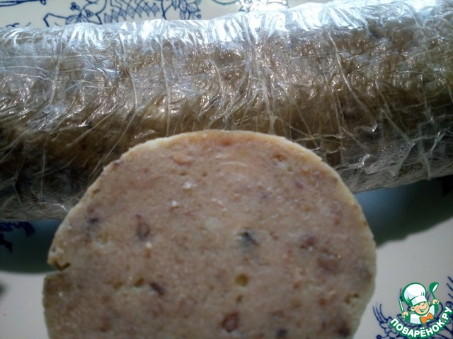 Выложить в пищевую пленку, формируя колбаску, края завязать. В кипящую воду аккуратно опустить колбаски и варить 1 час при слабом кипении.
