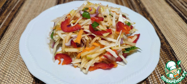 Это свежий овощной салатик из доступных продуктов- кладовая витаминов. Сейчас, когда свежей зелени ещё нет, а витаминоы так не хватает, этот салатик- палочка- выручалочка.
