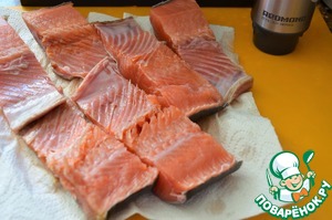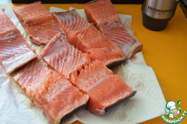 Рыбу почистить, нарезать на куски, удалить хребет.