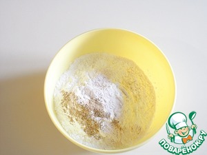 Приготовить сухую смесь - просеянную муку, крахмал, разрыхлитель, ванилин и кардамон соединить в одной емкости, тщательно смешать.