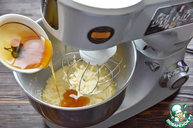 Продолжая взбивать, добавить яйцо в масляную смесь.