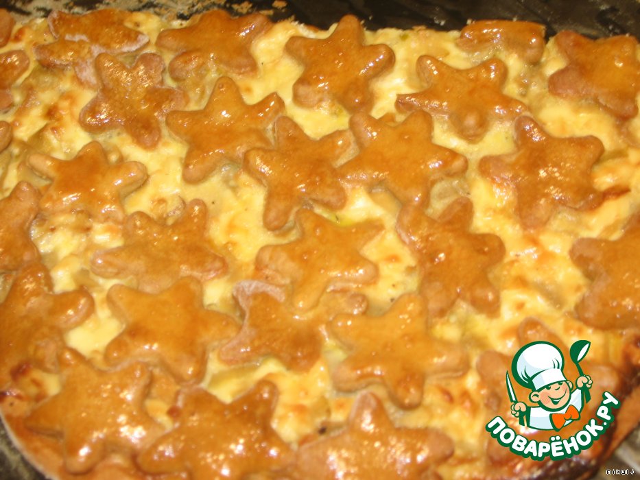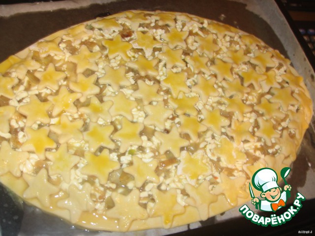 Из оставшейся части теста можно просто раскатать и порезать полосочки, прикрепить их на пирог, а можно формочками для печенья сделать вот такое звездное небо, или грибную поляну, или цветущую лужайку - ну что хотите. Смазать взбитым желтком.
