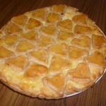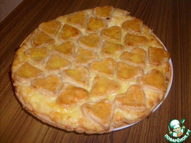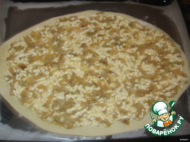 Тесто разделить на 2 части - 2/3 для нижнего коржа и 1/3 для верхнего. Для нижнего слоя раскатать тоненько - 0.5 см, перенести на скалке на противень.