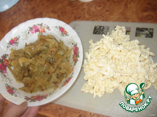 Готовим начинку. Лук порезать полукольцами, обжарить на растительном масле до готовности, посолить, оставить на бумажном полотенце, чтобы ушло лишнее масло. Сырки натереть на крупной терке. Один желток оставить для смазки, остальные яйца взбить. Перемешать лук, сырки и яйца.